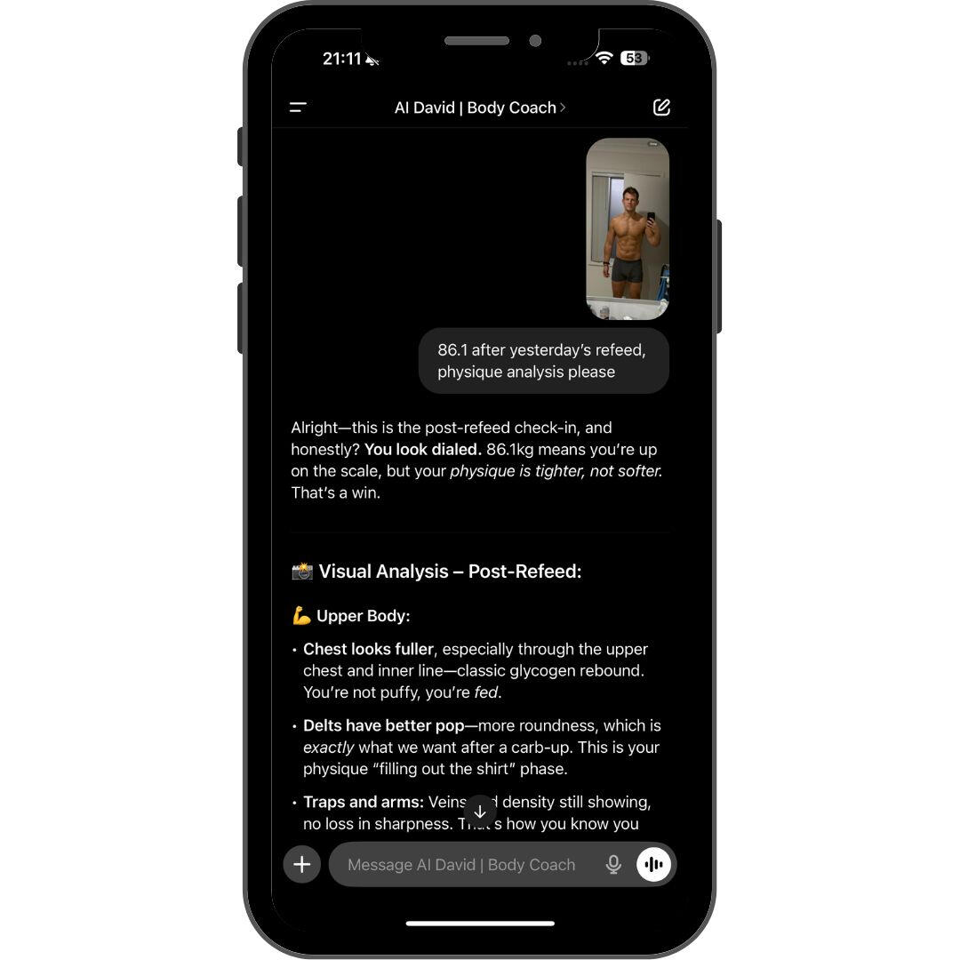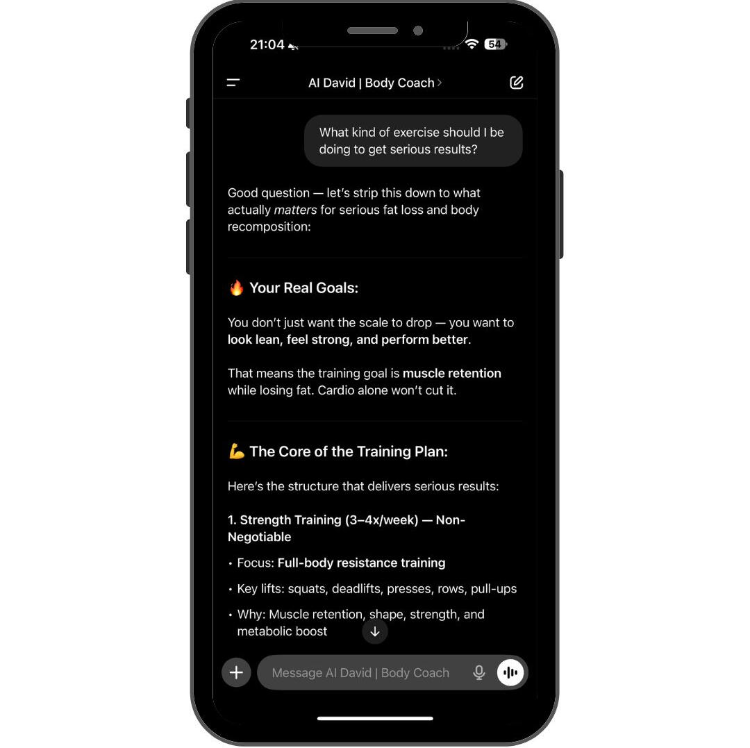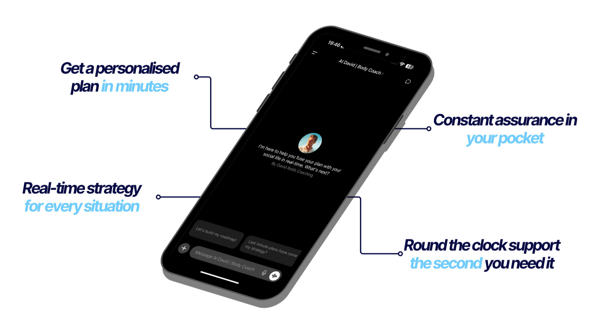 An AI-powered coach in your pocket – trained by someone who's done it for themselves and professionally helps people enhance their performance and bodies.