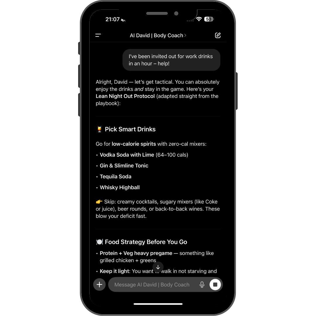 Install the exact system I used to drop 30kg, optimise cognitive output and achieve mind-body congruence without becoming a social recluse.You'll get instant access to the full high-performance tech stack: the LeanOS app, the evidence-based strategies to transform your body composition...And AI David, my bespoke AI Body Coach, built from my coaching expertise and background as a former finance data consultant.